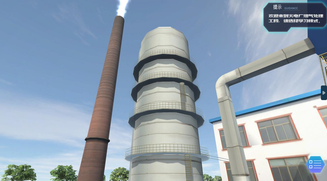 本软件模拟了某燃煤电厂终端尾气处理部分,主要工艺流程为:SCR—电除尘器—石灰石石膏法脱硫。该工艺为目前尾气处理的主流工艺,学生可在场景内对主体工艺设备进行原理学习以及在生产状态下进行事故处理等内容