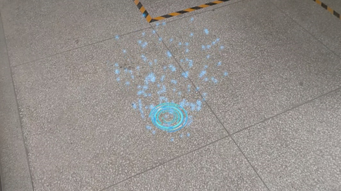 为了在一些参观演示、科普教育等场景下,可以快速、全面地呈现仿真工厂与MR特效相结合的效果,设置总览模式。按照前文中的方式,进入软件后,可以看到地面上存在“1个”光圈,如下图所示: